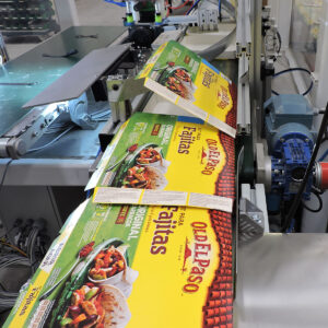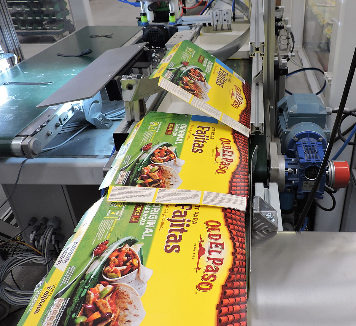 Máquina encajado final de fajitas, salsa y sazonador mediante cuatro robots «araña». Gran velocidad de proceso y correcta manipulación gracias a cámaras de visión.